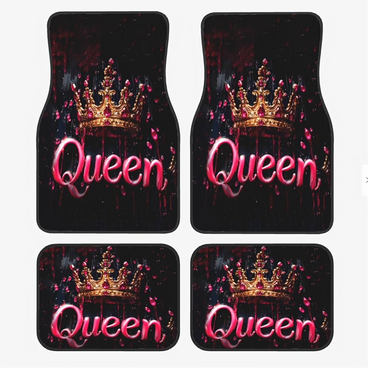 4pcs Fashion Queen Crown Pattern Car Mats – Polyester Floor Mats, Suitable for Cars and SUVs – Black with Pink Accents, Perfect Gift for Men and Women, Automotive Interior Accessories